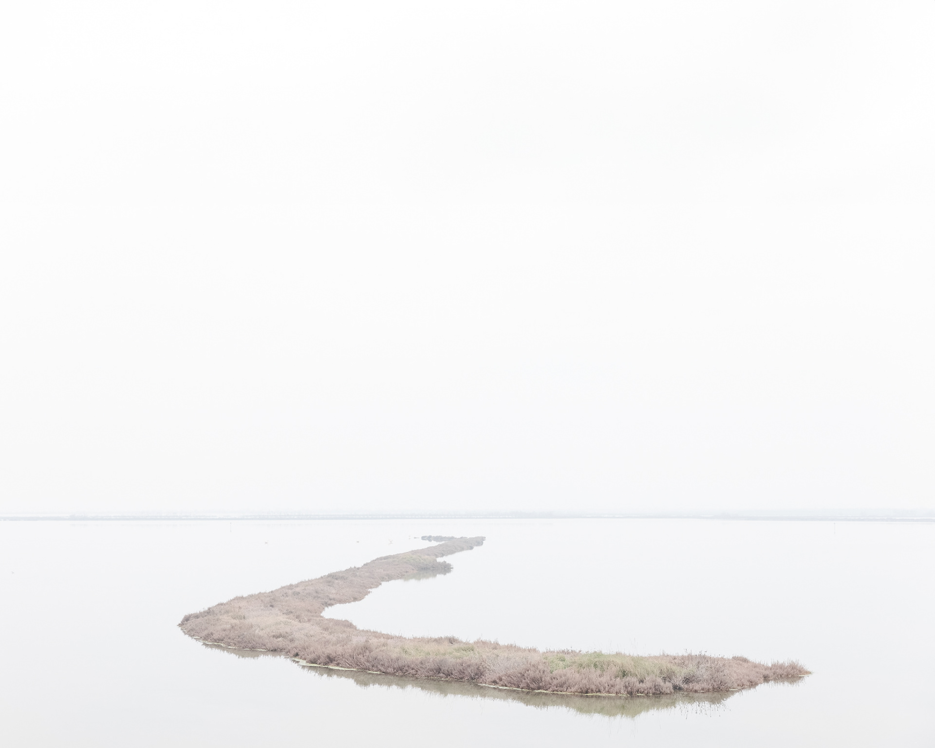 Le immagini nascono da un camminare lento, da un perdersi volontario, esplorativo, in un finis terrae anfibio, dove i confini mutano con l’acqua e con la luce. Tra lagune, rami fluviali, canali artificiali e il mare che preme all’orizzonte, la terra appare come una conquista fragile, strappata alle acque dalle bonifiche, continuamente esposta al loro ritorno. È un equilibrio instabile, una trattativa silenziosa tra ciò che emerge e ciò che tende a sommergere.