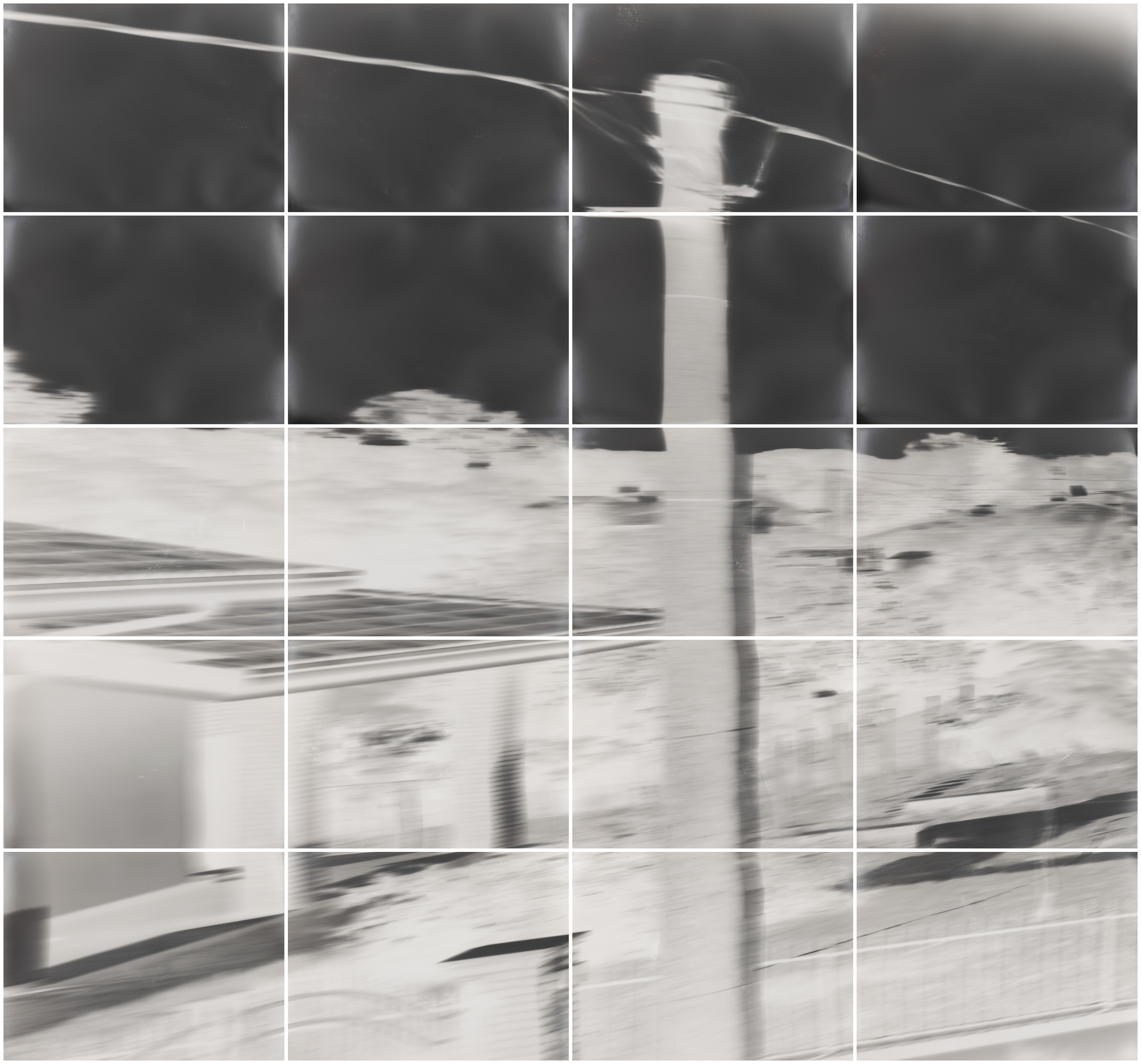 Il processo fotografico di impressione, sviluppo e fissaggio è stato realizzato interamente all’interno di un’unica stanza/camera oscura. obscura deconstruction of a landscape, è un’indagine del mezzo fotografico e una decostruzione di una porzione particolare del paesaggio esterno, che permea in un luogo intimo e personale.
